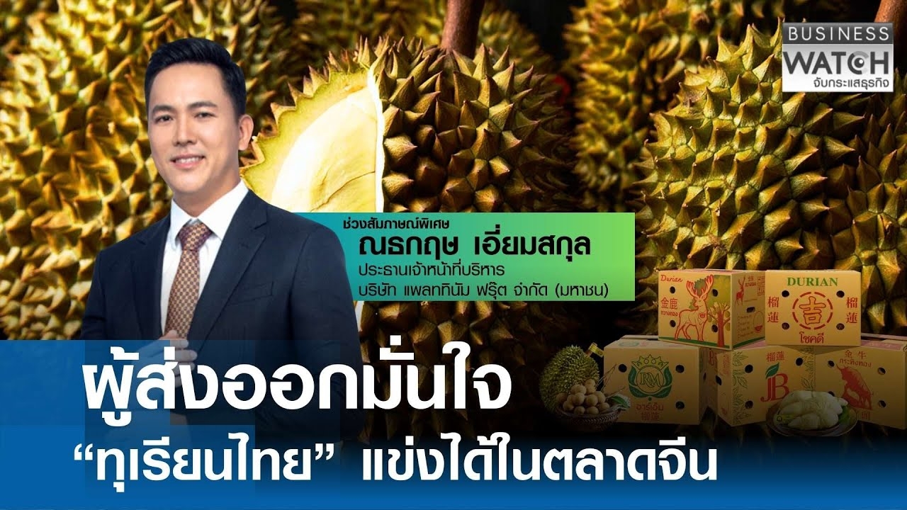 Business watch ทางช่องTNN พูดคุยกับผู้ส่งออกทุเรียนรายใหญ่ คุณณธกฤษ เอี่ยมสกุล ประธานเจ้าหน้าที่บริหาร บริษัท แพลททินัม ฟรุ๊ต จำกัด ถึงแนวโน้มปริมาณการส่งออกและราคาทุเรียนในปีนี้จะปรับตัวดีขึ้นมากน้อยแค่ไหนรวมถึงการทวงคืนตลาดจีนแข่งกับเวียดนาม